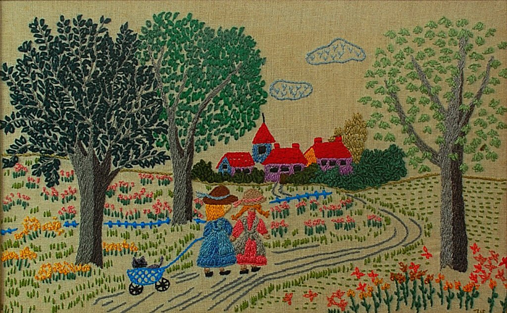 Disehelai kain belacu yang berukuran 32 x 240 cm, penuh dengan sulaman yang bercerita tentang kenangan masa kecil seorang anak perempuan...